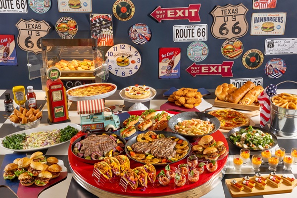 初夏のテーマは「ルート66」まるでアメリカを横断するようなランチビュッフェです。ニューヨーカー定番の「ホットドッグ」、テキサススタイルの「グリルドポーク バーボンBBQソース」、メキシコの「タコスステーション」など多彩なメニューを楽しめます。
